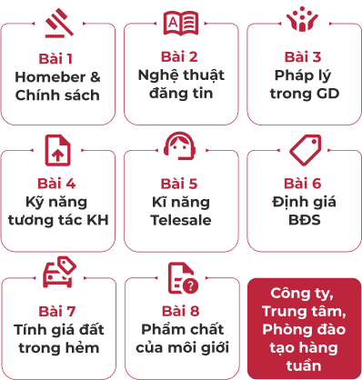Bạn sẽ được đào tạo 8 bài học căn bản để nhập môn vào nghề môi giới, và được Nhóm, Phòng, Trung tâm và Công ty cùng nhiều chuyên gia trong ngành đào tạo, hướng dẫn định kỳ hàng ngày, hàng tuần giúp công việc kinh doanh của bạn hiệu quả hơn.